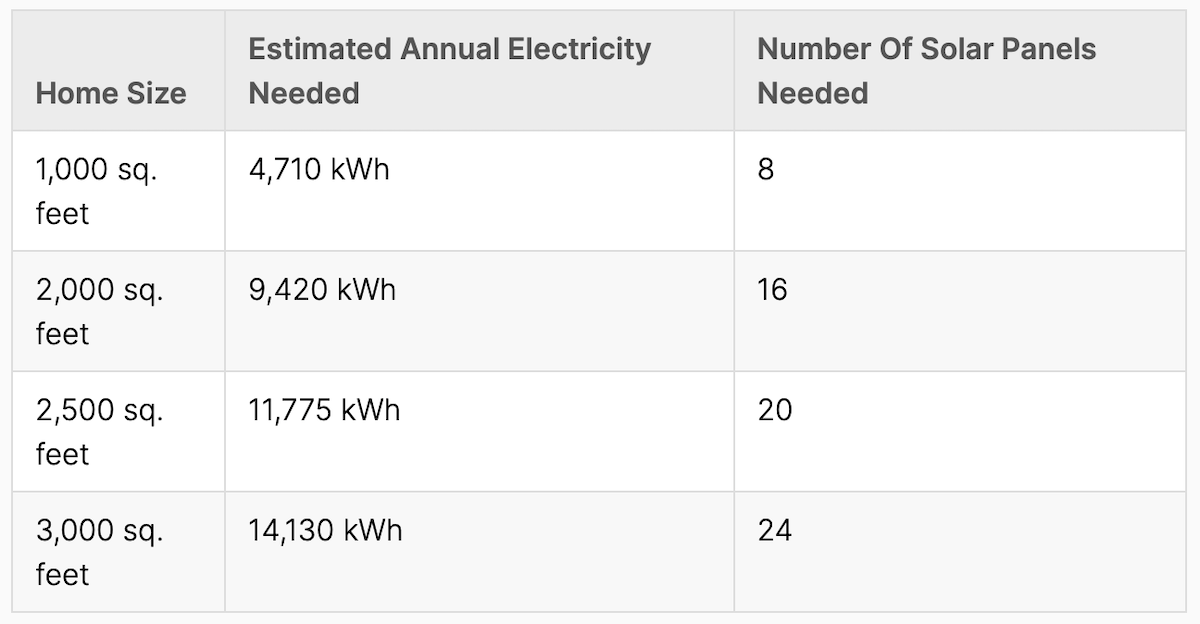 The following breakdown of home/property size, estimated annual electricity needed, and number of solar panels required can help you determine how right solar is for your property: